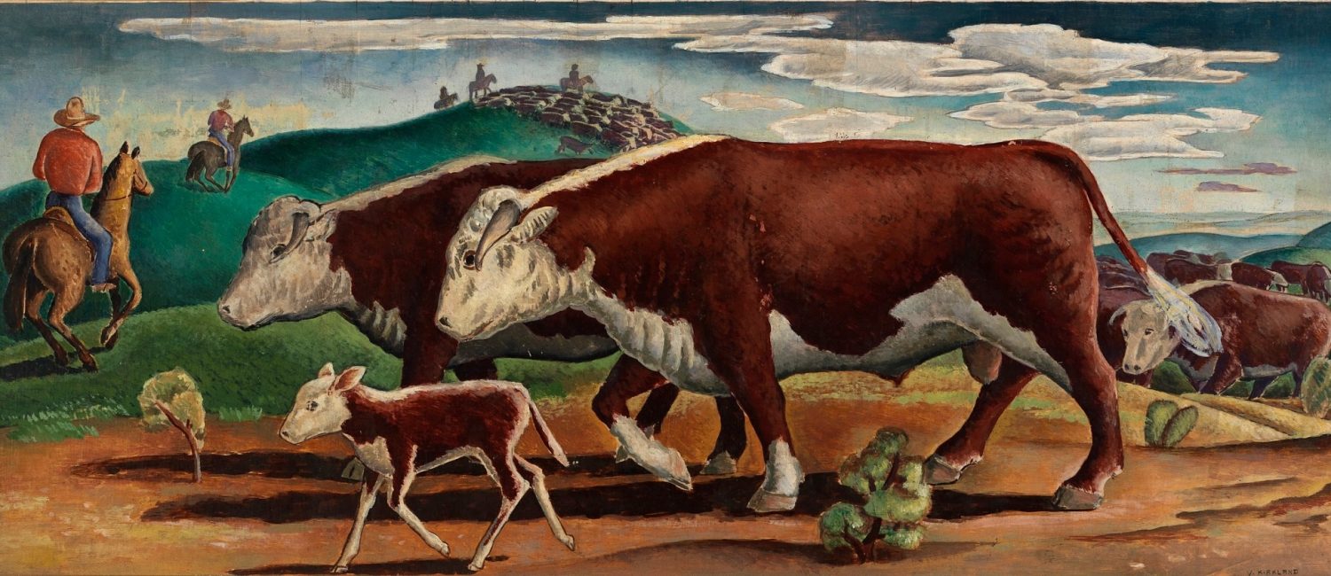 In 1938, Vance Kirkland, was commission to paint the historical “Cattle Round-Up” mural hanging in the Eureka, Kansas post office. The oil on fiberboard, mural measures 17 3⁄4 x 32 3⁄8 in. (45.1 x 82.2 cm.), and is listed on the Smithsonian American Art Museum collection. The post office is listed in the National Register of Historic places as well as a contributing member of the historical district in Eureka, KS.